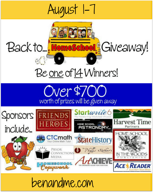 Remember to visit Marcy over at Ben and Me and enter the Back to Homeschool Giveaway. There are TWO major prizes up for grabs.